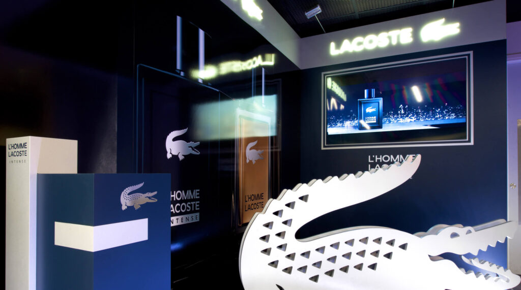 Specialist VM installation and temporary retail space build for Lacoste at a major international sporting event.